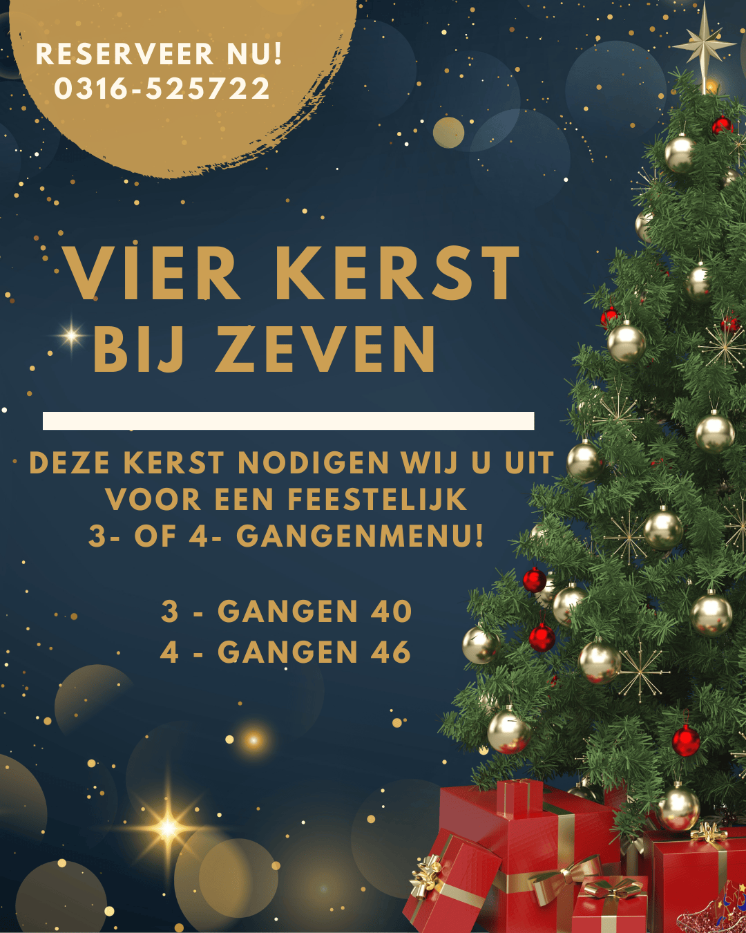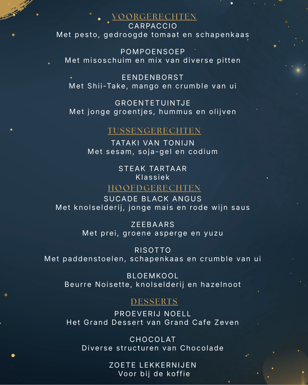 Beleef een bijzondere en smaakvolle kerst bij Grand Café Zeven! Laat je verrassen door een feestelijke avond vol sfeer, verfijnde gerechten en mooie smaken — de perfecte manier om de feestdagen te vieren.